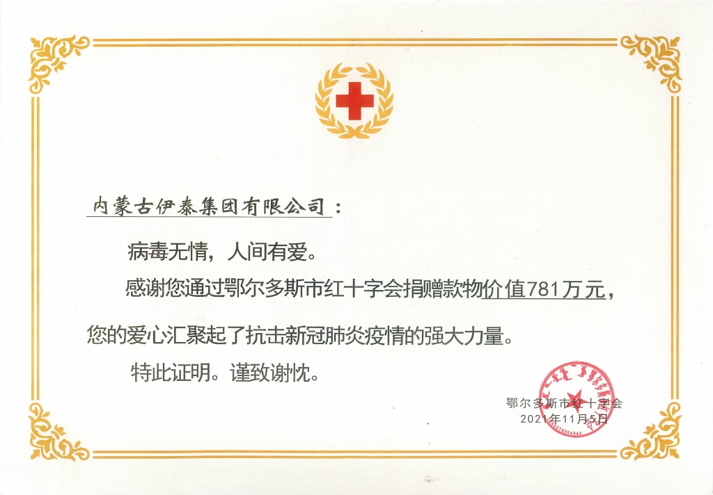 11月5日,鄂尔多斯市疫情防控集成式自动化核酸检测实验室捐赠仪式在市卫生健康大厦举行。集团公司捐赠781万元物资助力鄂尔多斯疫情防控。鄂尔多斯市副市长王心宇、市卫健委党组书记、主任王枫、市红十字会党组书记、常务副会长白同等出席捐赠仪式。王心宇为爱心企业颁发了捐赠证书。